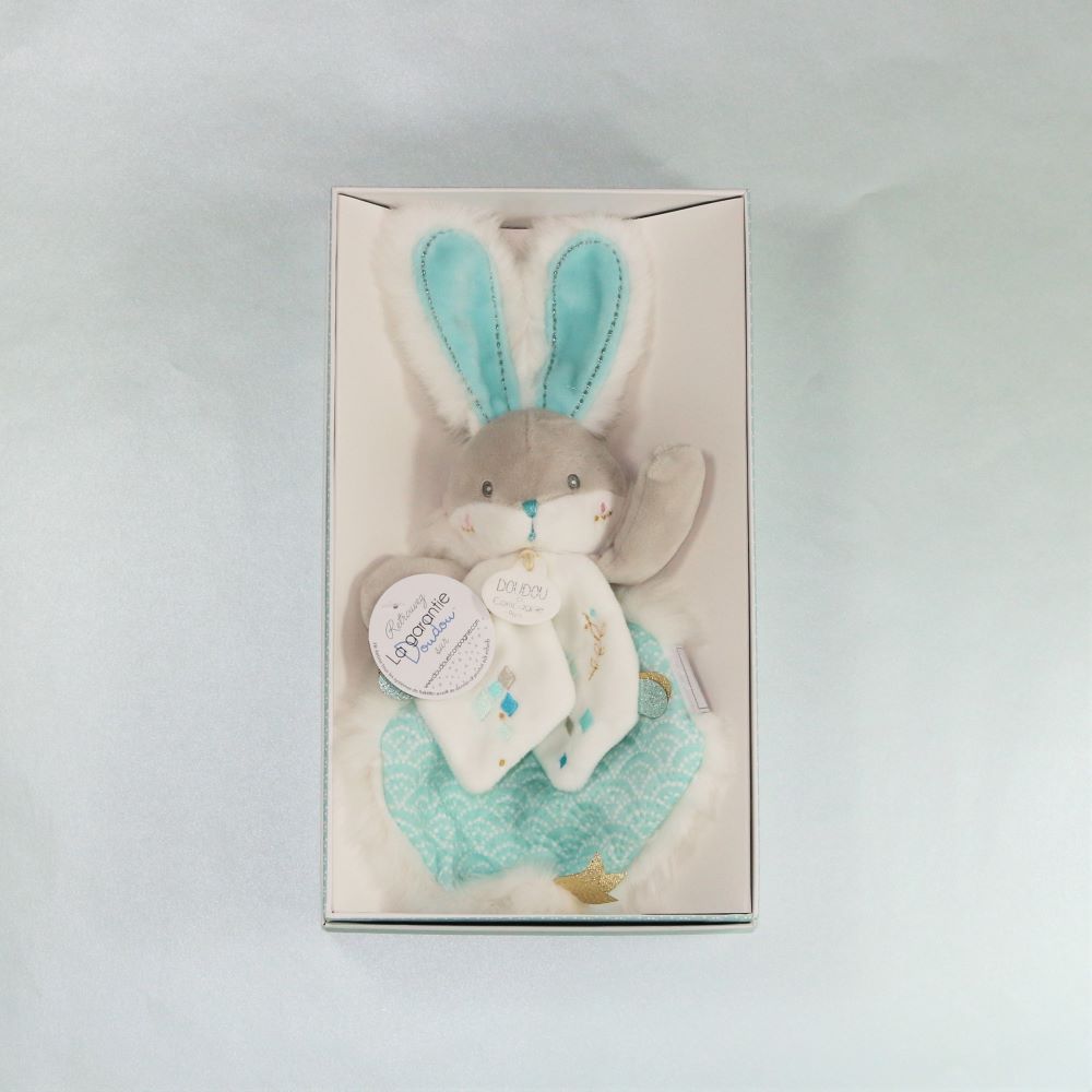 Peluche Coelhinho “Lapin de Sucre” da marca Doudou et Compagnie com o típico “doudou” que os bebés tanto apreciam pelo conforto e segurança que lhe transmite.