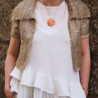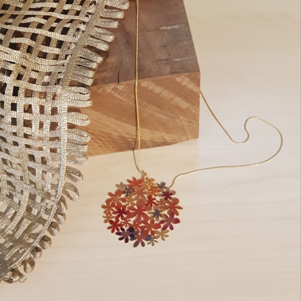 Inspirada nas hortências, tão presentes nos jardins portugueses e especialmente na ilha de S. Miguel nos Açores, esta peça é fabricada em latão com banho de prata e encontram-se disponível no tom, laranja. O fio tem 23cm de comprimento e é dourado no caso do pendente laranja