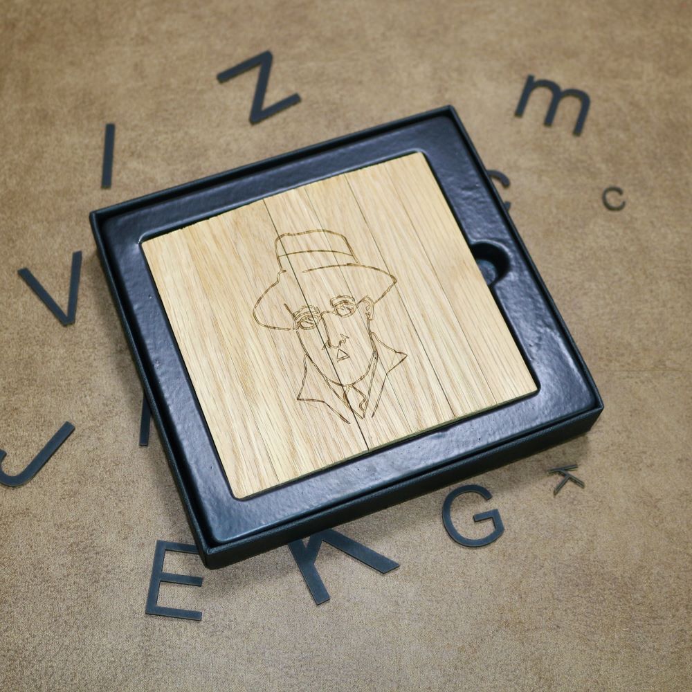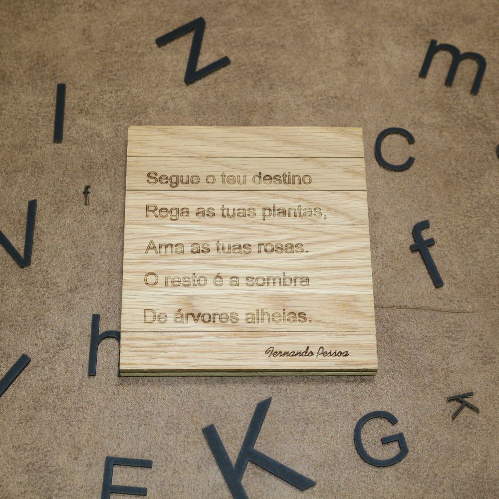 Copo rebatível fabricado em Portugal, em madeira natural e gravado a laser, com figuras de poetas portugueses.
