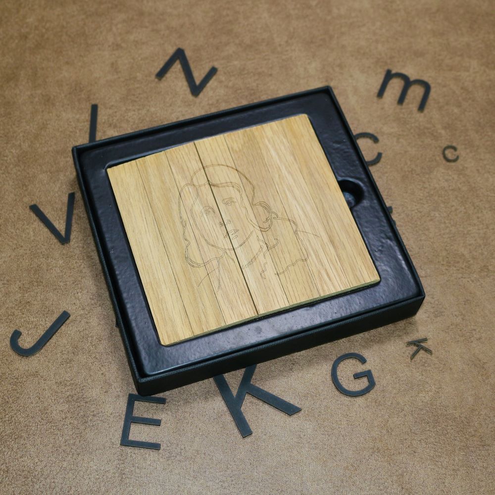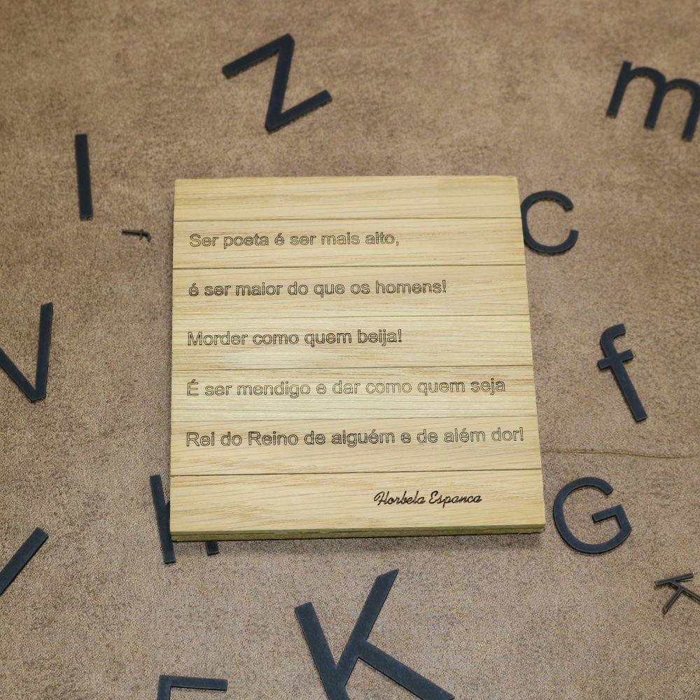 Copo rebatível fabricado em Portugal, em madeira natural e gravado a laser, com figuras de poetas portugueses.