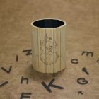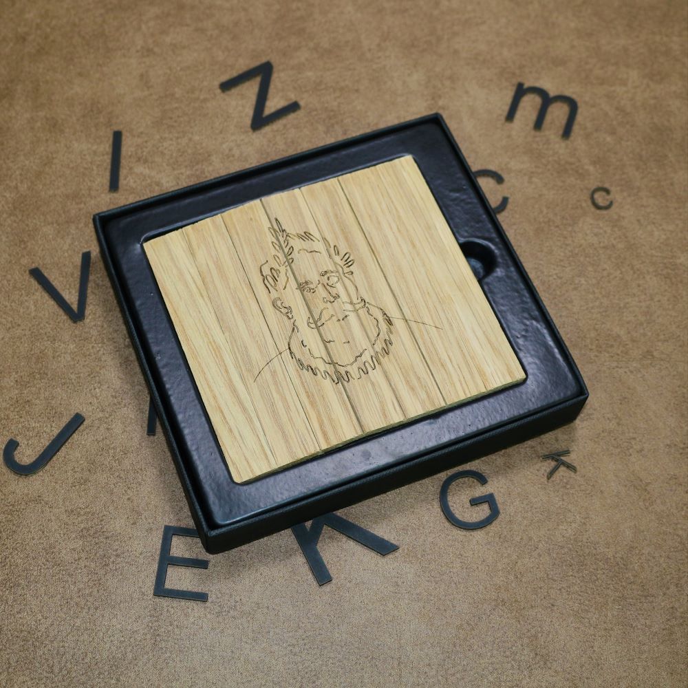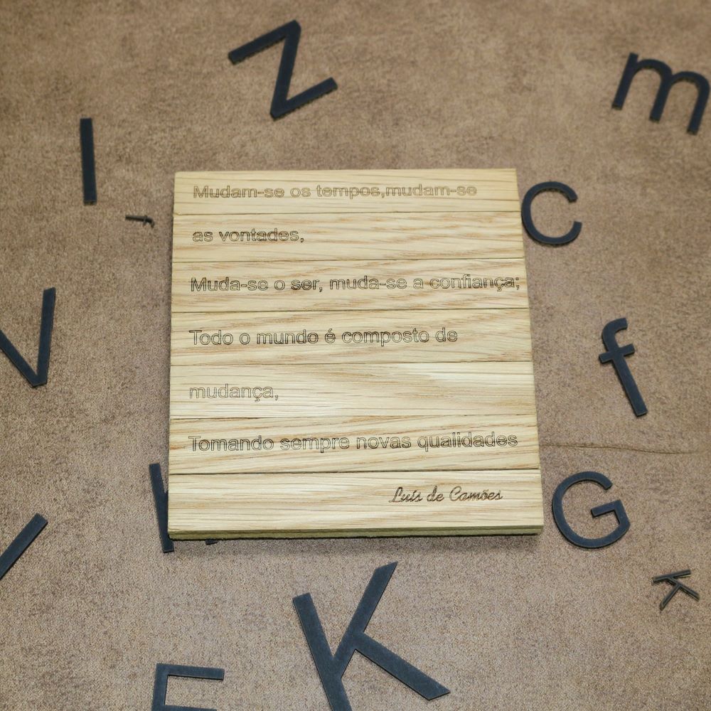 Copo rebatível fabricado em Portugal, em madeira natural e gravado a laser, com figuras de poetas portugueses.